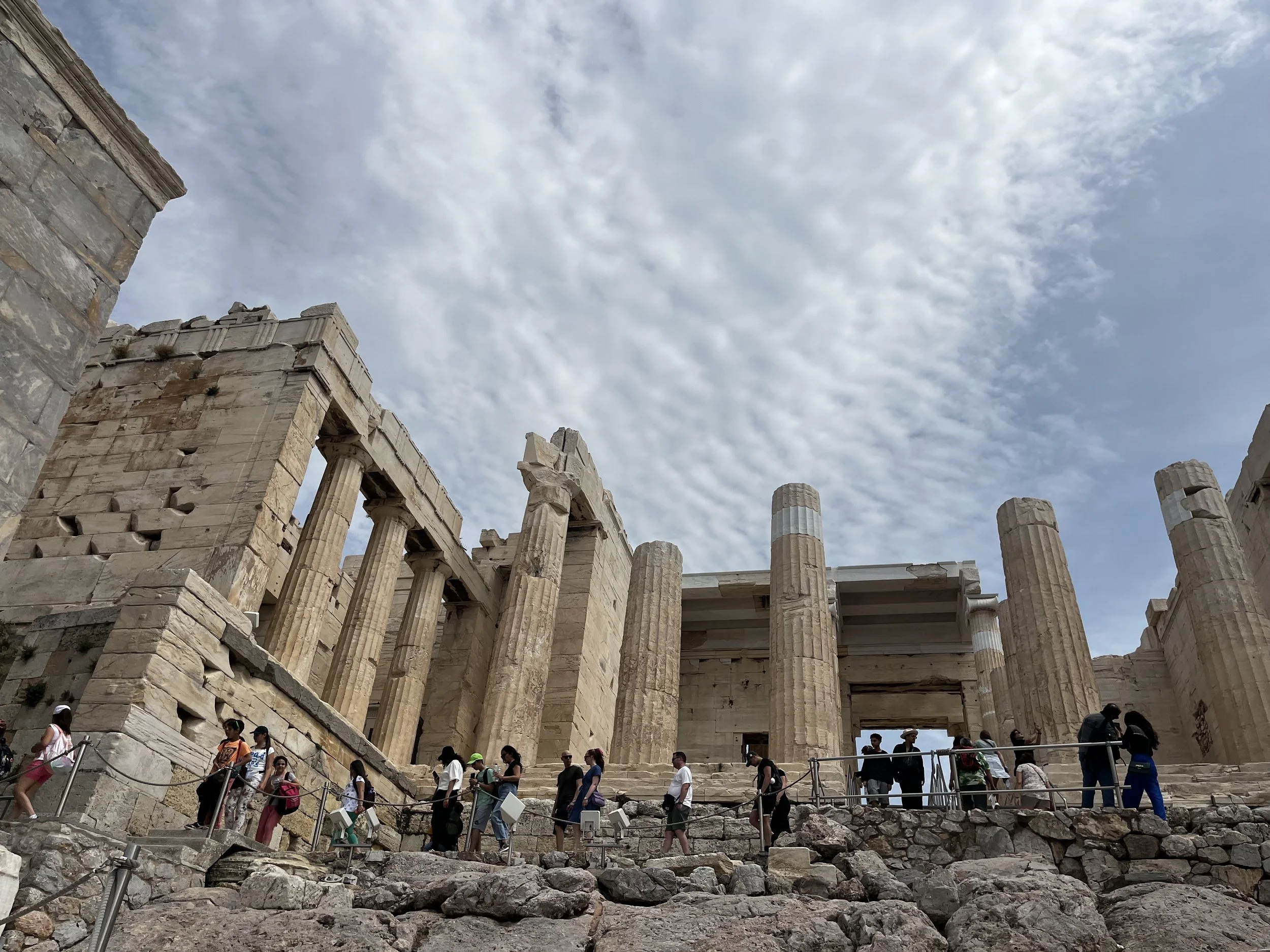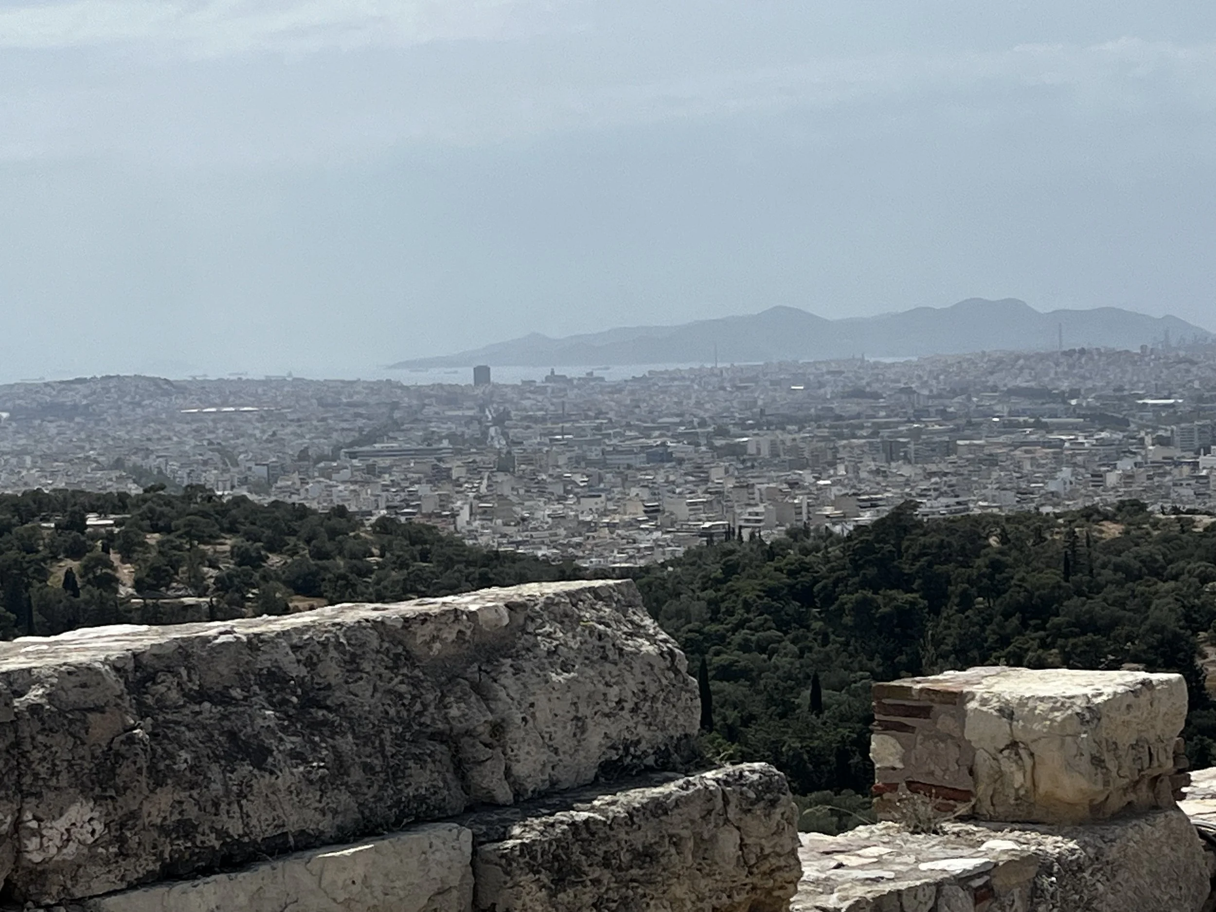 下から大理石の階段を登っていくと、ここからは聖域ですよとはっきりと区別する入り口の建物がある。プロピュライアと呼ばれている。パルテノン神殿の柱と同じ大理石の柱が並ぶ。戦いの女神でアテネの守護神アテナ女神と勝利の女神NIKE(どうしてもナイキとしか読めないけど、ギリシャ語ではニーケとかニケとからしい)を祀る神殿もここにある。ここから振り返って下を眺めてみると、この高台に立つ者は勝者になった気分になると思わせる。2500年ぐらいも前、遥か昔、この高台に登った人たちは崇高な気持ちになれたのだと思う。軍事的、政治的、宗教的と、それら建造物の目的の考察はさておき、ここは実際に行ってみて感じることが非常に重要。