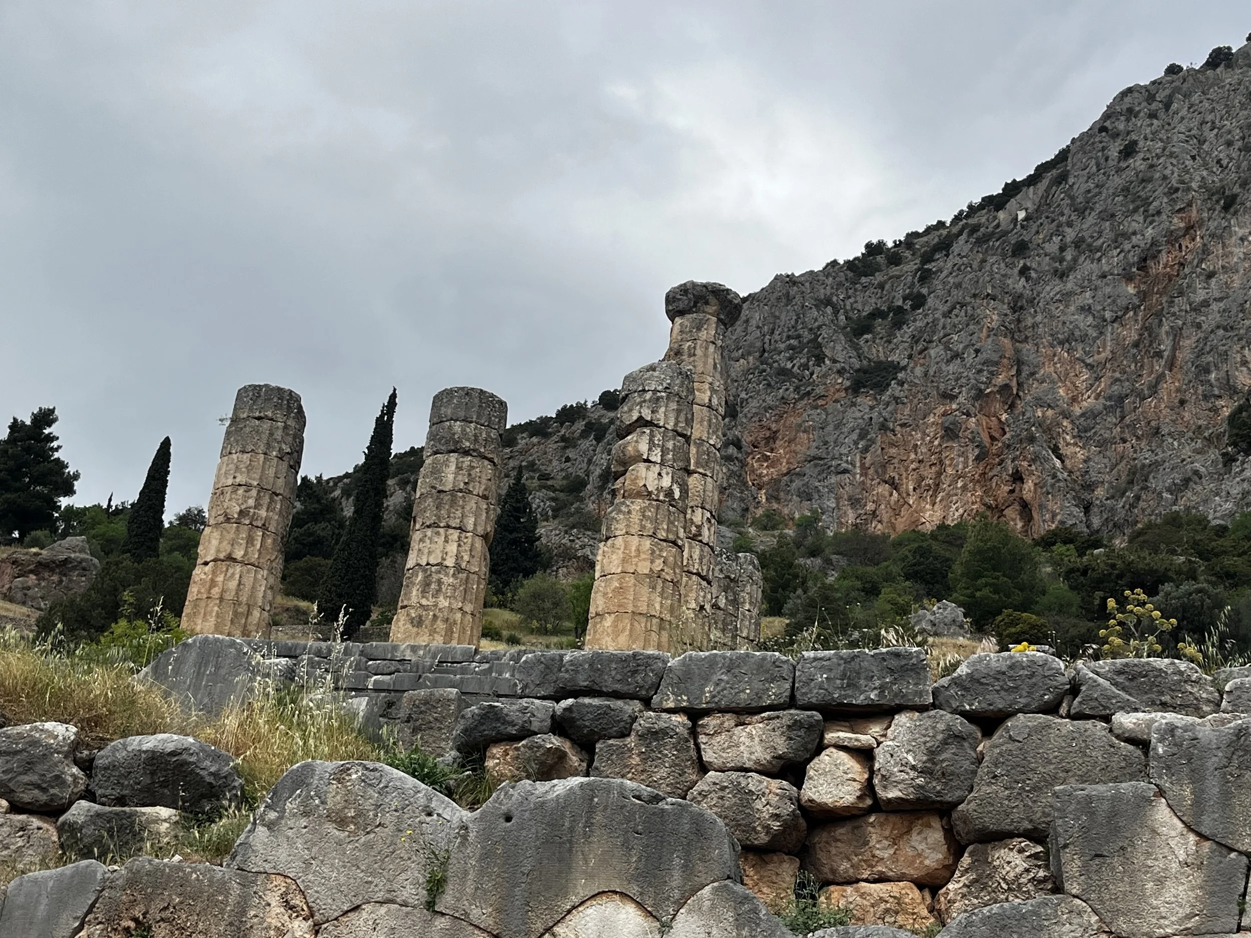 標高約500mのこの地にアポロン神殿を建てて、ピュティアという巫女を通じてアポロンの神託を伺った古代ギリシャの人々、紀元前8世紀頃のこと。彼らにとってここは世界の中心だった。大地のへそといわれている石まである。そこにピュティアが青銅の三脚に座って、地底からのガスを吸ってトランス状態になり、アポロンの神からの神託を告げたのだ。ピュティアというのは個人の名前ではなく、この巫女たちの役割の名称。紀元前6世紀ごろには、ギリシア全土から巡礼者が訪れて、さまざまな伺いを立てていた。重要な決断は、ここでの神託を受けてからなされていた。
